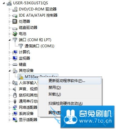 3.此时设备管理器会出现一个带问号(或者感叹号)的设备,对其右击“更新驱动程序”