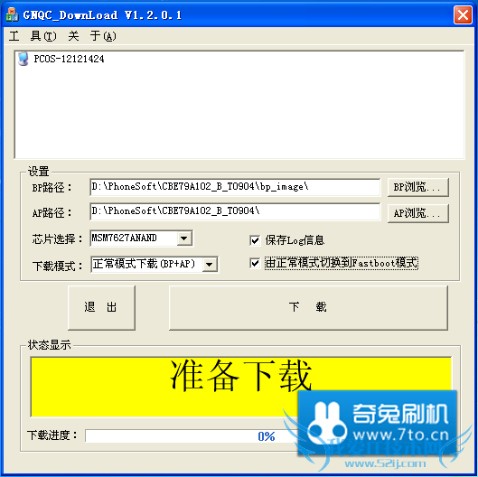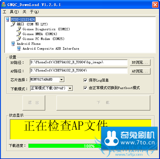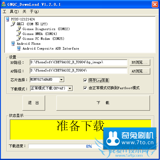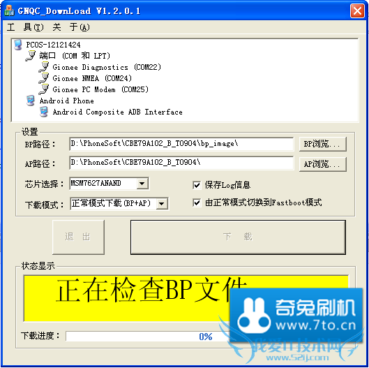 NandFlash芯片下载特别说明:如果有使用虚拟机的用户,可将设备的VID和PID添加到虚拟机的设备检索中,其中高通驱动的VID是05C6,金立驱动的VID是271D,QDLoader端口的Pid是9008,Diag端口的Pid是9006。NANDFlash芯片使用串口通讯的方式下载BP,在BP下载完成之后会切换到Fastboot模式,然后开始下载AP,建议用户先运行本工具,然后在连接主板和PC,下面将以MSM7627ANAND芯片来说明NANDFlash芯片的下载过程,模式以正常下载BP和AP为例