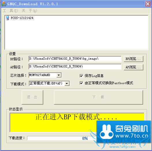 点击“BP浏览…”按钮和“AP浏览…”按钮分别选择本地的BP软件和AP软件存放路径,在“芯片选择”下拉列表中选中“MSM7627ANAND”,然后在下载模式下拉选项中选择“正常模式下载(BP+AP)”并且勾选上“由正常模式切换到fastboot模式”选择框,然后点击下载按钮,开始下载软件,工具会先下载BP软件再下载AP软件,首先工具会先检查用户选择的软件路径下是否包含有正确的文件,然后开始进入BP下载模式,如下图所示: