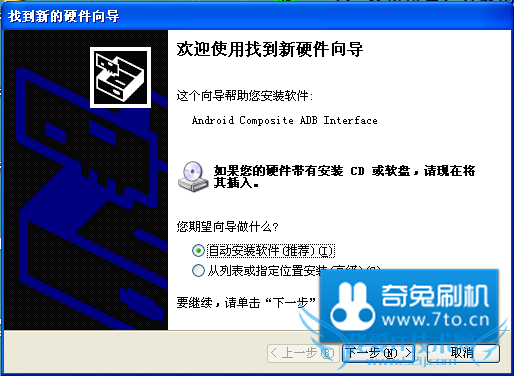 插入手机让系统完成设备的安装,此过程中会出现如下图所示的窗口,选择“自动安装软件(推荐)(I)”并点击“下一步”系统将自动完成设备的安装。