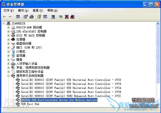 5、驱动安装成功后在“设备管理器”里的“通用串行总线控制器”节点下会有“NVDIA USB Boot-recovery driver for Mobile devices”,如下图所示: