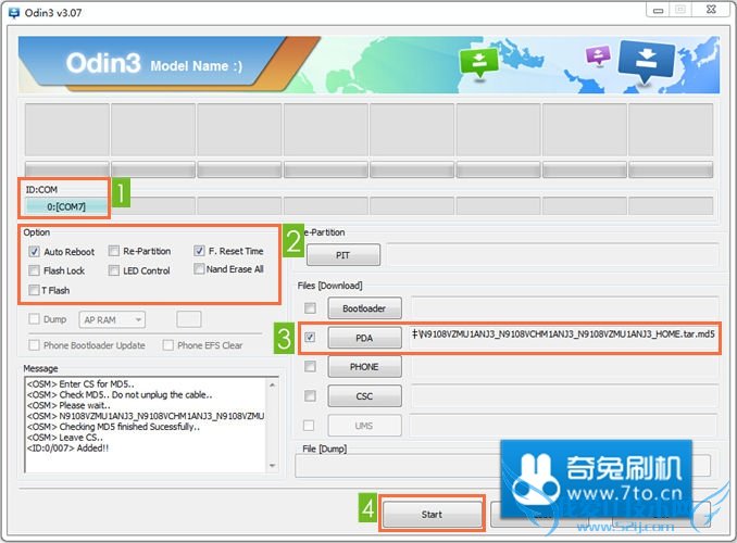 手机会进入挖煤模式,再运行刷机工具内的 Odin 3.exe,按照下图操作: