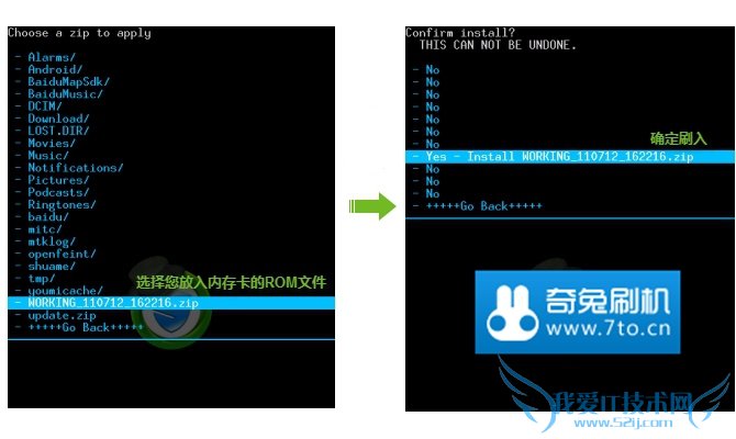 - 选择您所放入内存卡的ROM文件,名字为update.zip - Yes - Install 确定刷入