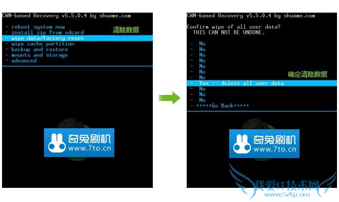 - wipe data/factory reset 清除数据 - yes -- delete all user data 确定清除