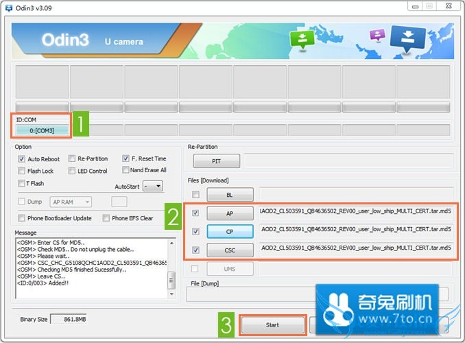 点击 CSC 按钮,选择固件文件夹下的 CSC_CHC_G5108QCHC1AOD2_CL503591_QB4636502_REV00_user_low_ship_MULTI_CERT.tar.md5 ;