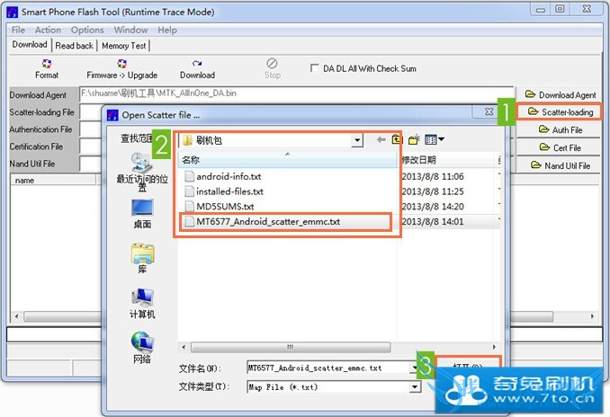2.选择 固件 -> MT6577_Android_scatter_emmc.txt ,并打开,如下图: