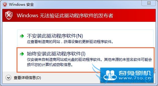 4.出现红色的驱动安装确认框,请选择“始终安装此设备驱动程序”。