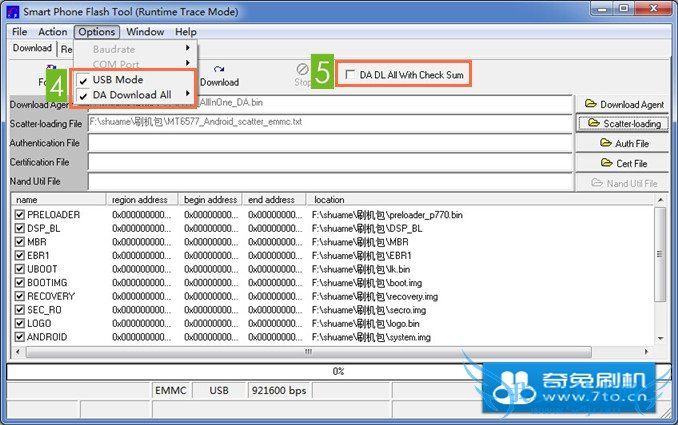 3.接着检查 Option -> USB Mode 和 DA Download All 还有 DA DL All With Check Sum 有没有勾选上,如下图: