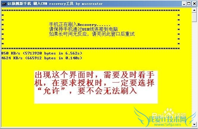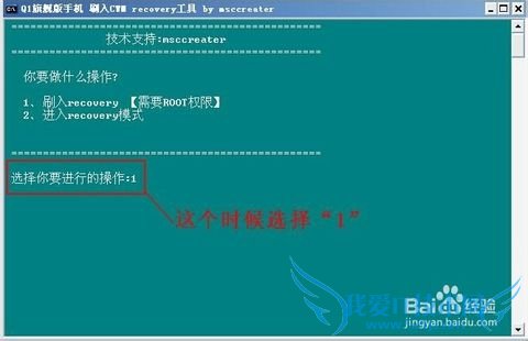 4.会弹出下图的1图,这时USB数字线要连接好手机与电脑,然后选择”1“,按回车键(enter键),弹出2图(黄底图),这时一定要查看手机,手机界面会弹出一个”允许“或是”拒绝“的选择,请一定要选择”允许“,要不会无法刷入成功。