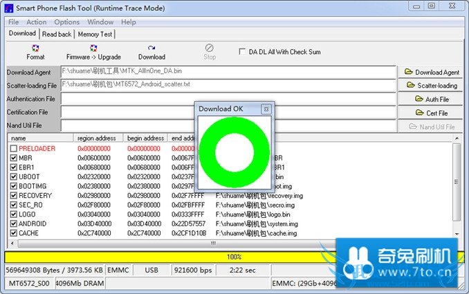 选择 固件 -> MT6572_Android_scatter.txt ,并打开,再点击 Download 如下图: