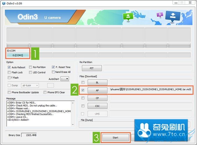 运行刷机工具 Odin3.09.3.exe手机进入挖煤模式后连接电脑,odin工具的com如下图1表示驱动正常;