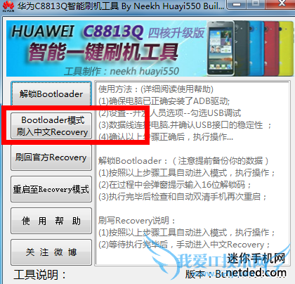 4.然后找到解压出来的exe格式的华为C8813Q recovery工具,直接双击打开,然后点击【Bootloader模式刷入中文recovery】按钮