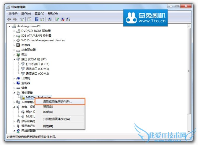 3.设备管理器会出现一个带问号的设备,对其右击“更新驱动程序”