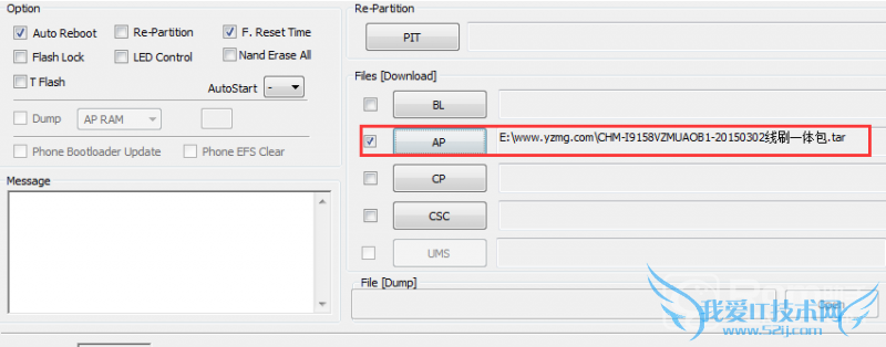 6.打开odin软件之后软件会自动识别你的手机,识别成功后会在ID:COM处显示蓝色的(表示手机连接成功了,如果没有显示蓝色的,换个usb口试试,或者看下驱动有没有安装好),然后勾选AP(旧版本的是选择PDA)选择上面下载的tar格式的刷机包。