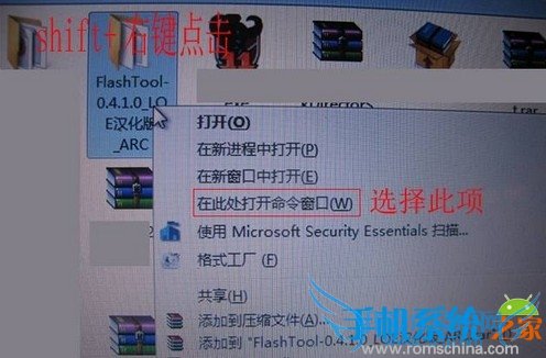 11. 解压FlashTool到自己指定的文件夹后,按住“shift”键右单击该文件夹,在弹出的菜单中选择“在此处打开命令窗口”,如下图所示: