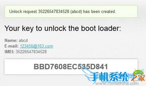 10. 提交之后救回生成解锁码(KEY),保存好这个解锁码待用,如下图所示