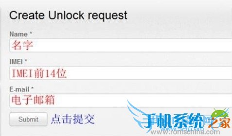 9. 接下来大家应该都知道了,填写你的个人信息以及我们之前查询的IMEI码了,填完后点击“Submit”提交,如下图所示: