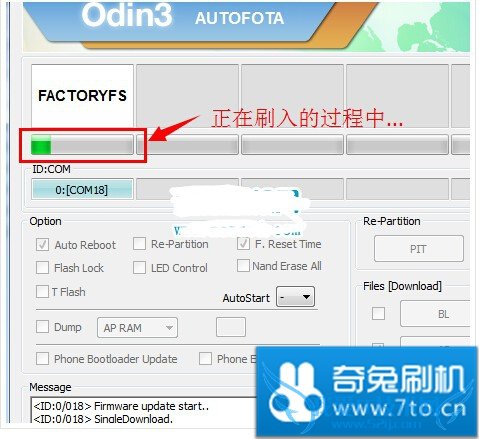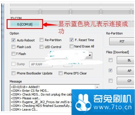 4:打开odin软件之后软件会自动识别你的手机,识别成功后会在ID:COM处显示蓝色的(表示手机连接成功了,如果没有显示蓝色的,说明没有有连接好),然后勾选AP,选择上面下载并解压出来的tar或md5格式的文件包。