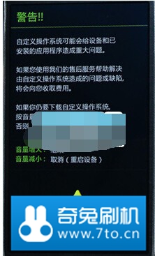 1:手机先完全的关机,然后同时按住手机的音量下键 + HOME键 + 电源键,等待3秒,出现下图界面