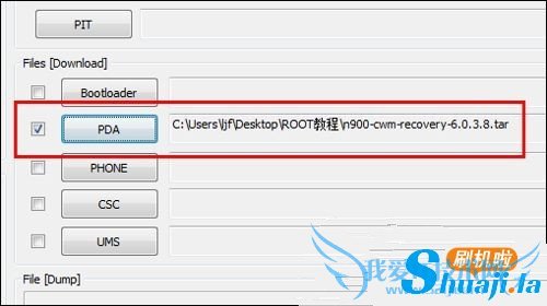 5.点击选择PDA按钮并选中自己刚刚下载放在电脑上的三星Galaxy Note3(N900国际版)tar格式Recovery包