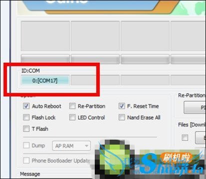 4.解压下载在电脑的三星Galaxy Note3(N900国际版)刷机工具Odin,打开OdinV3.0.7英文版,等待之后Odin软件会识别手机,识别成功后如下图所示COM会显示蓝色填充