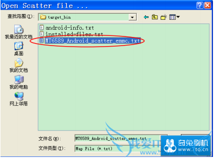 6:然后在刚才解压出来的target_bin文件夹中选择MT6573_Android_scatter.txt(注意:这个文件的名字不同的固件有所不同)