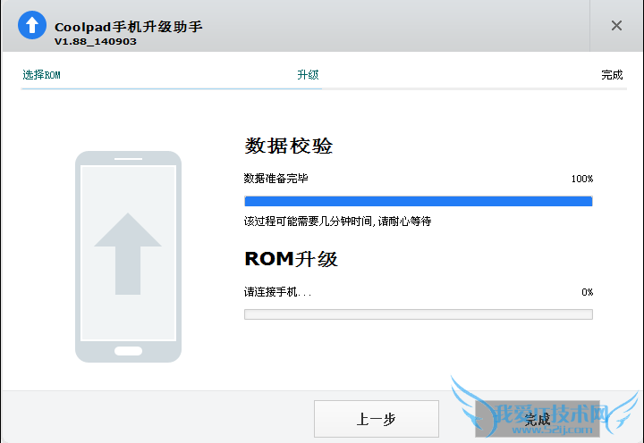 6、此时将手机用数据线与电脑相连接,刷机助手的ROM升级进度条会开始走动,等待完成