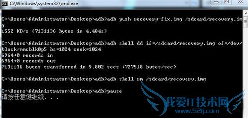 3.点击“rec.bat”后,手机连接电脑,然后工具会自动刷入第三方recovery,如下图;
