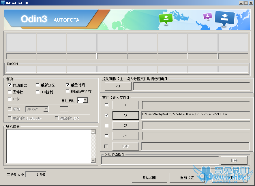2.这里我们使用ODIN线刷recovery,方法如线刷官方包一样,在AP处加载线刷recovery包(为什么不是卡刷recovery呢,原因很简单,卡刷recovery前提是你已经刷过recovery了,只是升级版本而已,通常只要recovery能用就不在乎版本高低,这里针对的是没有刷过机的用户)