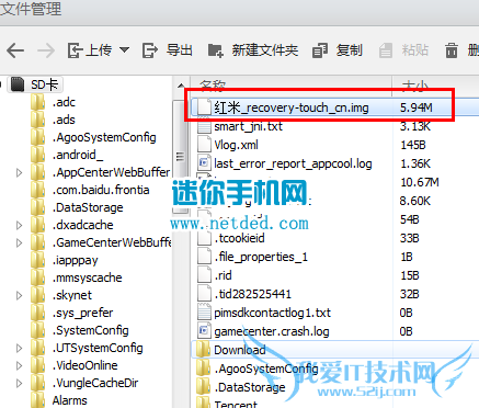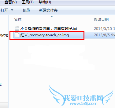 1:把上面下载下来的recovery包在电脑上进行解压,然后在解压出来的文件夹里找到【红米_recovery-touch_cn.img】文件,也就是.img格式的文件,直接复制到手机的SD卡根目录下。