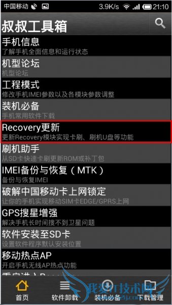3、手机打开移动叔叔工具箱,给予授权,然后进入,点击【Recovery更新】,如下图;