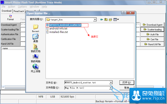 4.单击Scatter-loading,选择正确的Scatter file,然后选择target_bin/MT6573_Android_scatter.txt