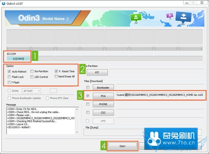 手机会进入挖煤模式,再运行刷机工具内的 Odin 3.exe,按照下图操作: