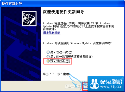 3.然后打开手机USB选项,用数据线将手机和电脑连接。在弹出硬件更新向导版面后,先勾选【否,暂时不】继续点击下一步。