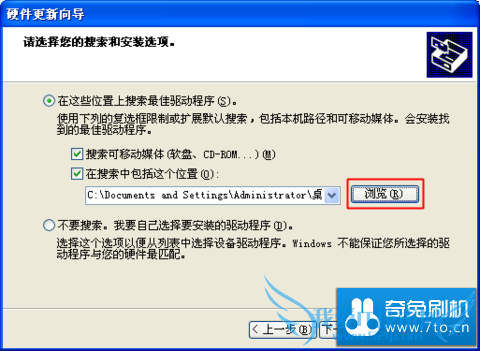 5.在新的【请选择您的搜索和安装选项】版面中,勾选第前三个选项,然后点击【浏览】