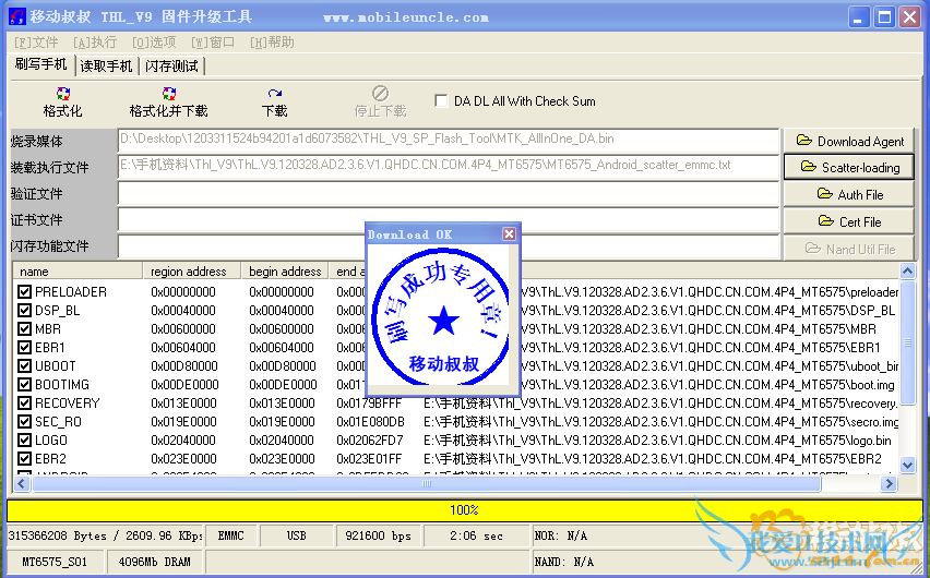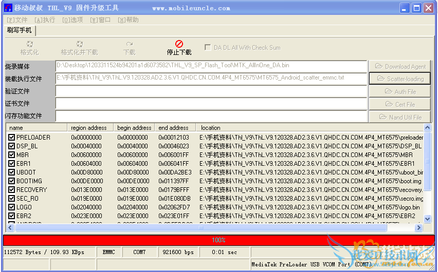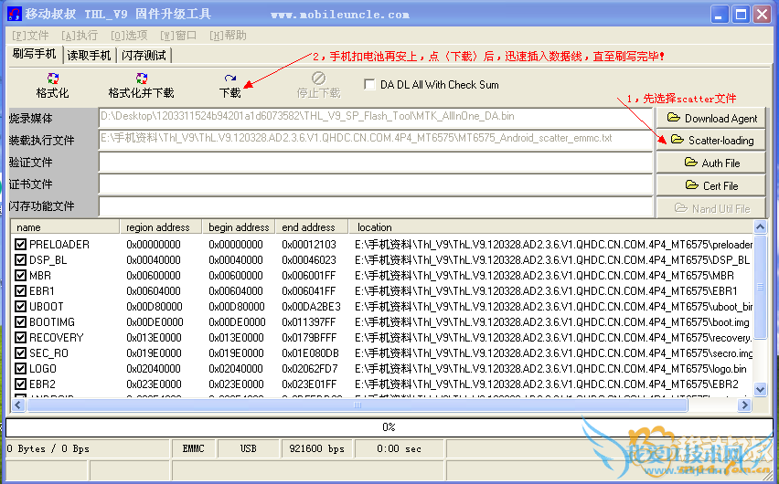 这里说明下,第一项和第二项的勾勾是属于格式化的操作内容,有些机器容易因此丢IMEI,所以把他的勾勾去掉,然后让手机用数据线连接电脑,然后拔开电池,点击“下载”按钮,迅速装上电池,即可触发刷机过程。。。