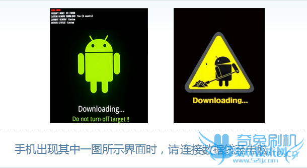 1:进入挖煤模式:将手机扣电池,5秒后装上,不要开机,同时按住"音量下键+Home键+电源键",出现下面图片的两种情况。出现左图的,请按一下音量上键。出现右图或只显示downloading的请直接下一步,不需要按按键。 (如果按照这个方法无法出现下面的界面,请百度搜索你的手机进入挖煤模式的方法,例如:s5830i 进入挖煤模式)