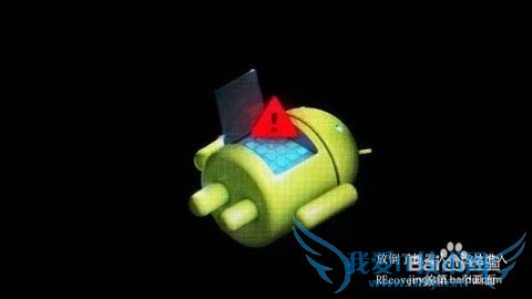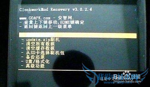 进入Recovery模式后,有一个安卓机器人,肚子打开,躺在地上。这时,按主菜单按或房子键,就看到操作界面了。
