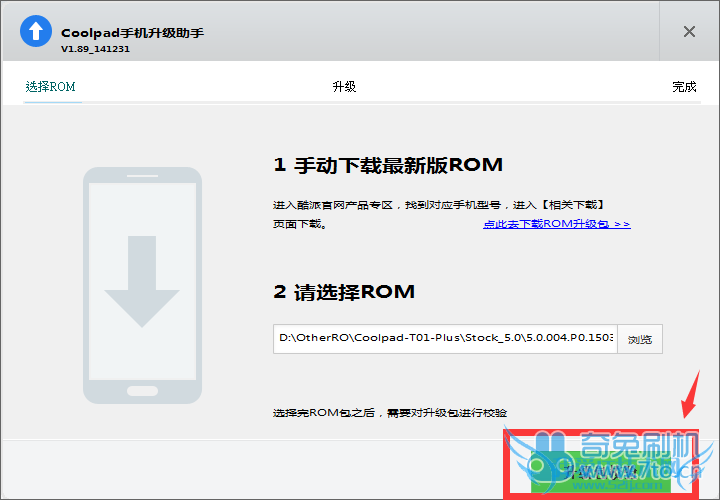 3、运行Coolpad手机升级助手,选择后缀为.CPB的线刷包文件,点击升级包检验,待程序自动检验完成;