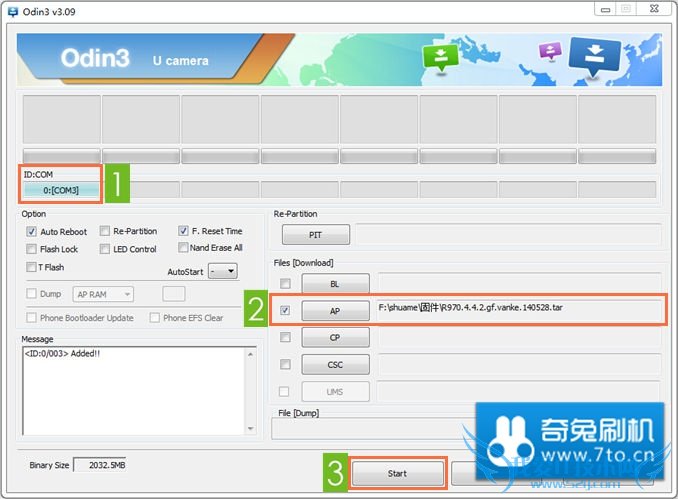 运行刷机工具 Odin3.exe手机进入挖煤模式后连接电脑,odin工具的com如下图1表示驱动正常;