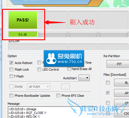 6:刷完之后,上面会显示【PASS】字样就表示刷入成功了。