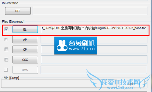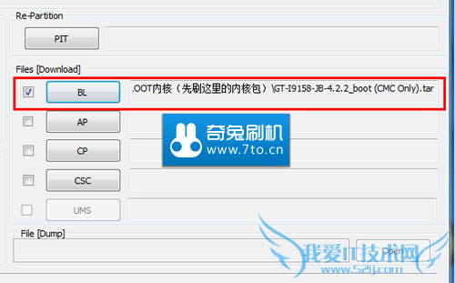 4:打开odin软件之后软件会自动识别你的手机,识别成功后会在ID:COM处显示蓝色的(表示手机连接成功了,如果没有显示蓝色的,说明没有有连接好),然后勾选BL,选择上面下载并解压出的tar格式的内核包,先刷第一个内核包,然后再刷第二个。