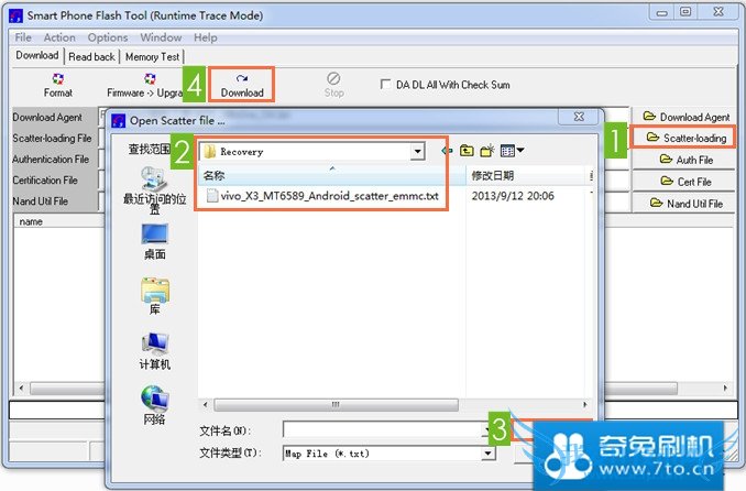 2.点击 Scatter-loading ,选择 recovery 目录下的 vivo_X3_MT6589_Android_scatter_emmc.txt ,并点击Download 如下图: