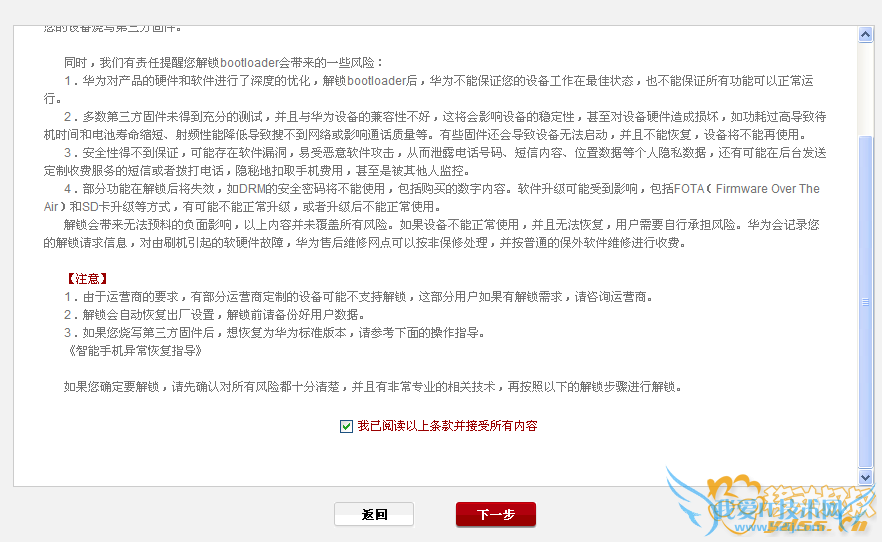 4.华为H60-L02荣耀6联通4G版手机解锁前,请提前备份好用户数据,华为H60-L02荣耀6联通4G版手机解锁成功后,将自动恢复出厂设置并失去Widevine功能。