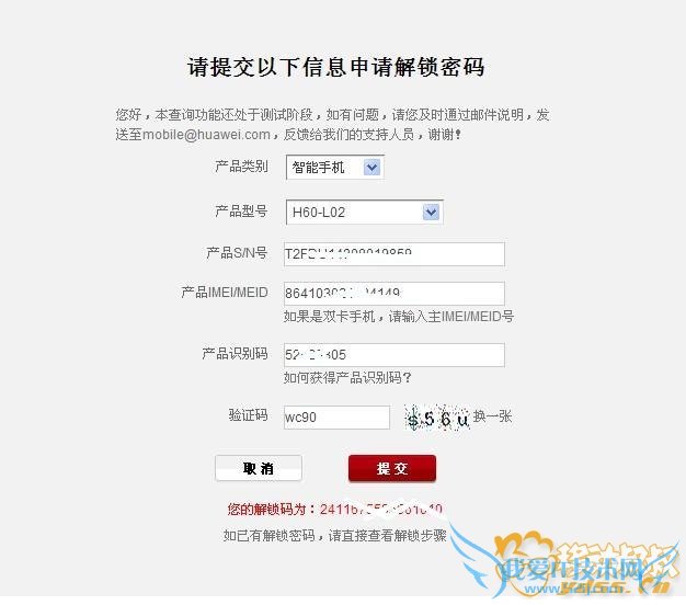 上面说的这些只是教大家如何把华为H60-L02荣耀6联通4G版的型号显示出来,要获取解锁码需要在后面的框中根据提示输入产品IMEI/MEID 和 产品识别码 以及 验证码 然后提交进行操作