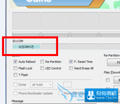4.打开odin软件之后软件会自动识别你的手机,识别成功后会在ID:COM处显示蓝色的(表示手机连接成功了,如果没有显示蓝色的,说明没有有连接好),然后勾选PDA,选择刚才下载下来的tar格式的recovery包。