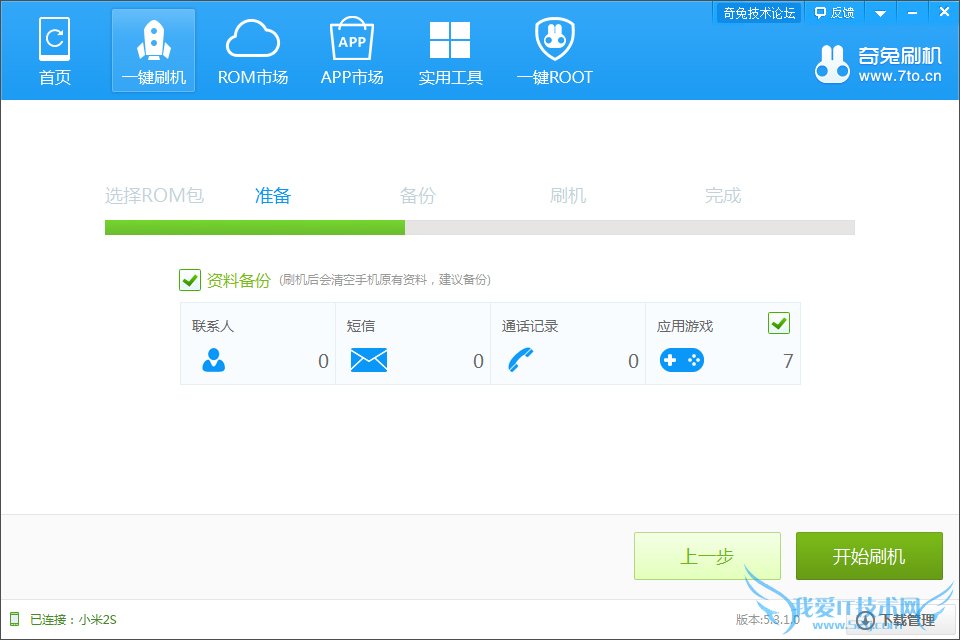 2.点击【一键刷机】,可以选择你要刷的小米M2/M2S ROM包,如果你还没有下载手机相关刷机ROM包,可以在奇兔刷机ROM市场下载。选择好手机的刷机ROM包之后,进入资料备份界面,刷机会清除联系人, 短信, 通话记录和应用程序,建议大家备份,刷机后可以还原。