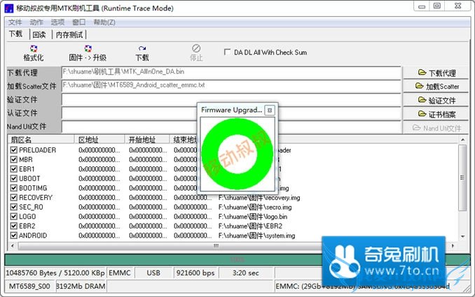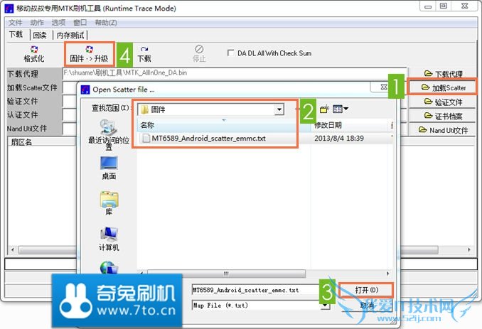 选择 固件 -> MT6589_Android_scatter_emmc.txt ,并打开,然后点击 固件->升级,如下图: