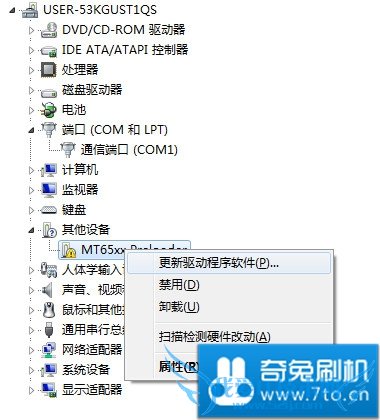 此时设备管理器会出现一个带问号(或者感叹号)的设备,对其右击“更新驱动程序”(有些手机可能会一闪而过,需要抓紧时间右击!)