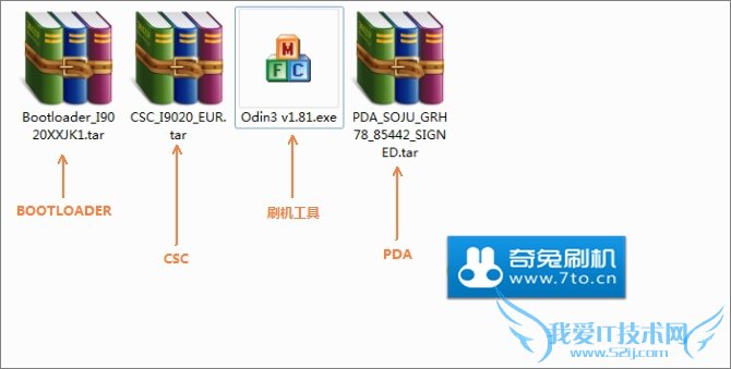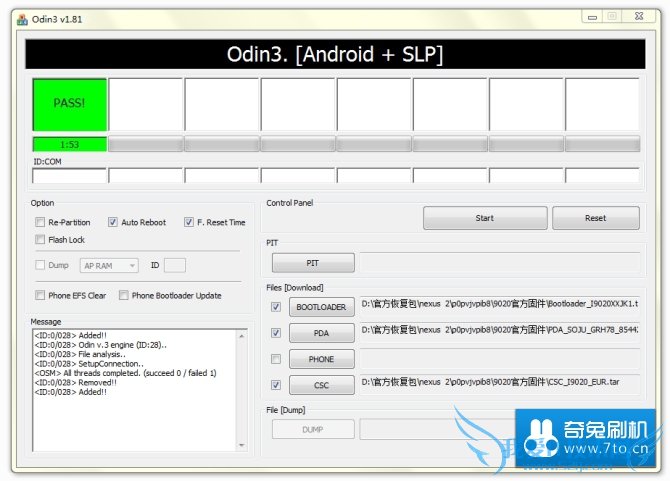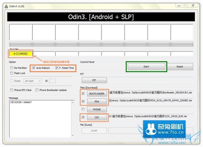 运行刷机工具包内的 Odin3 v1.81.exe 按照橙色框内设置好后, 点击绿色框内的 Start 开始刷机!